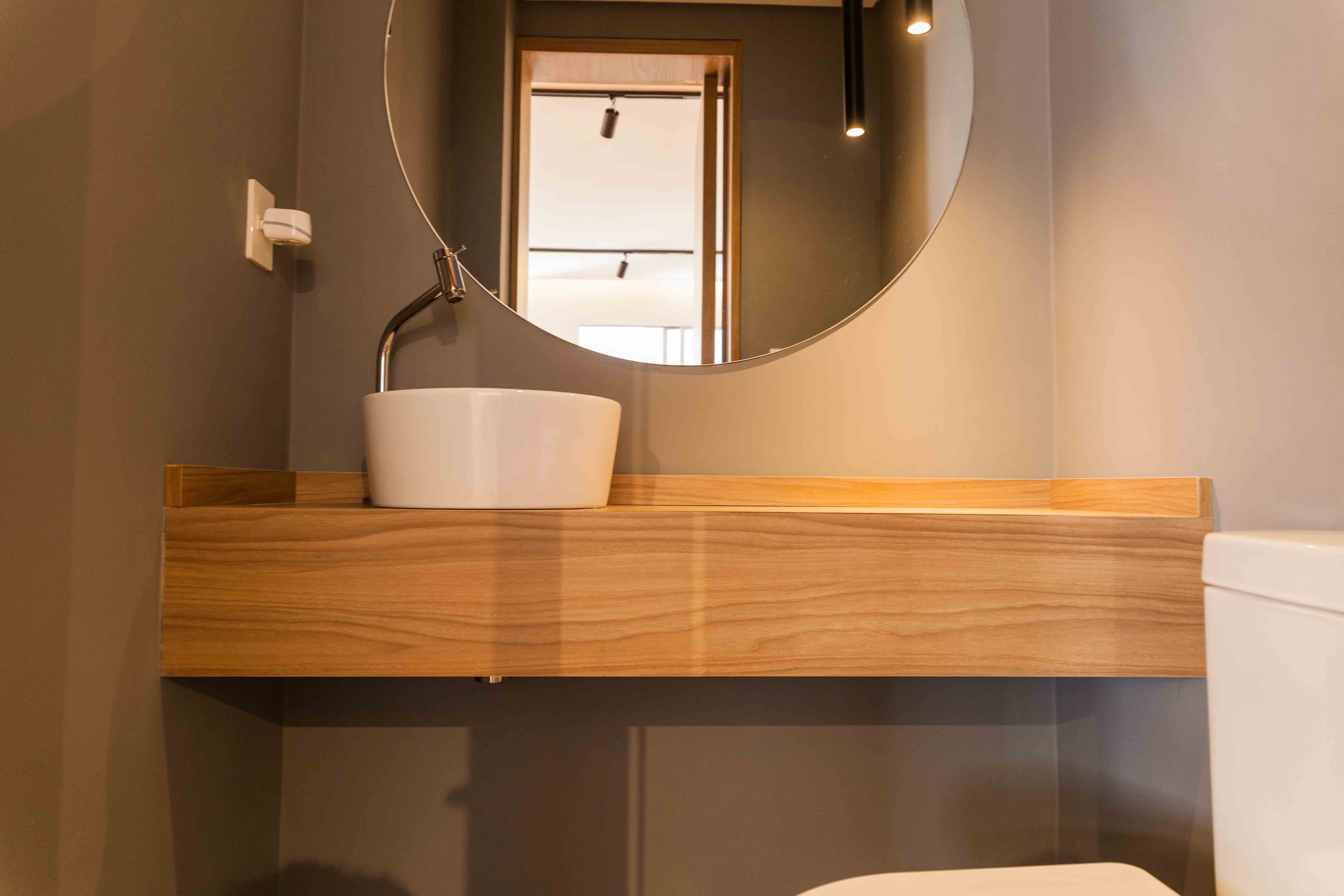 A integração da sala de estar com a cozinha é um dos maiores charmes do apartamento. A ideia é exatamente criar um ambiente de convivência entre as pessoas, sem paredes para limitar espaços. Essa integração ajuda também a deixar o ambiente ainda mais espaçoso e aconchegante. Outro ponto importante foi a criação de um lavabo e readequação da lavanderia e banheiro de serviço. Essas modificações deixaram a planta mais funcional e a circulação do apartamento mais definida.
