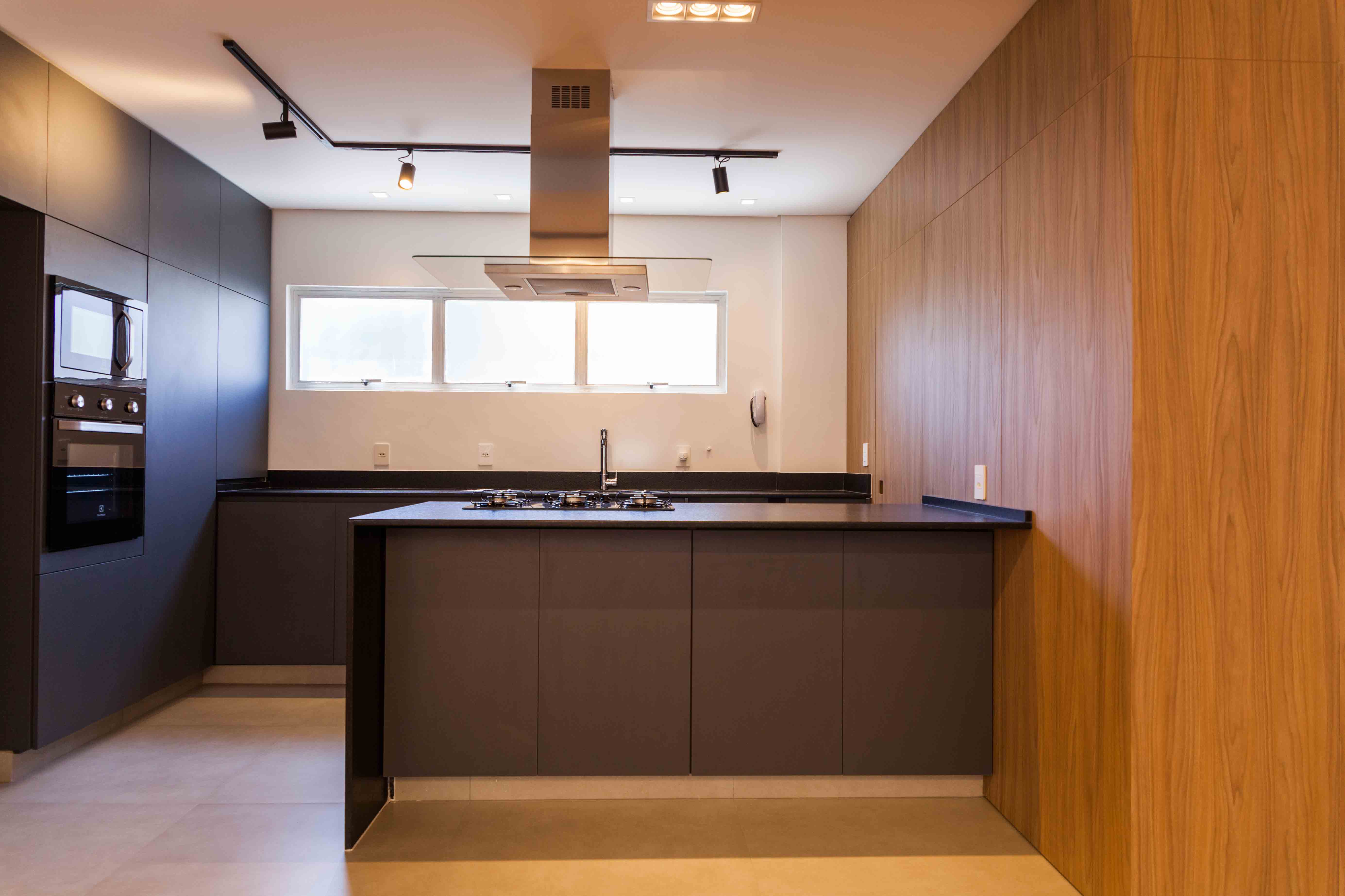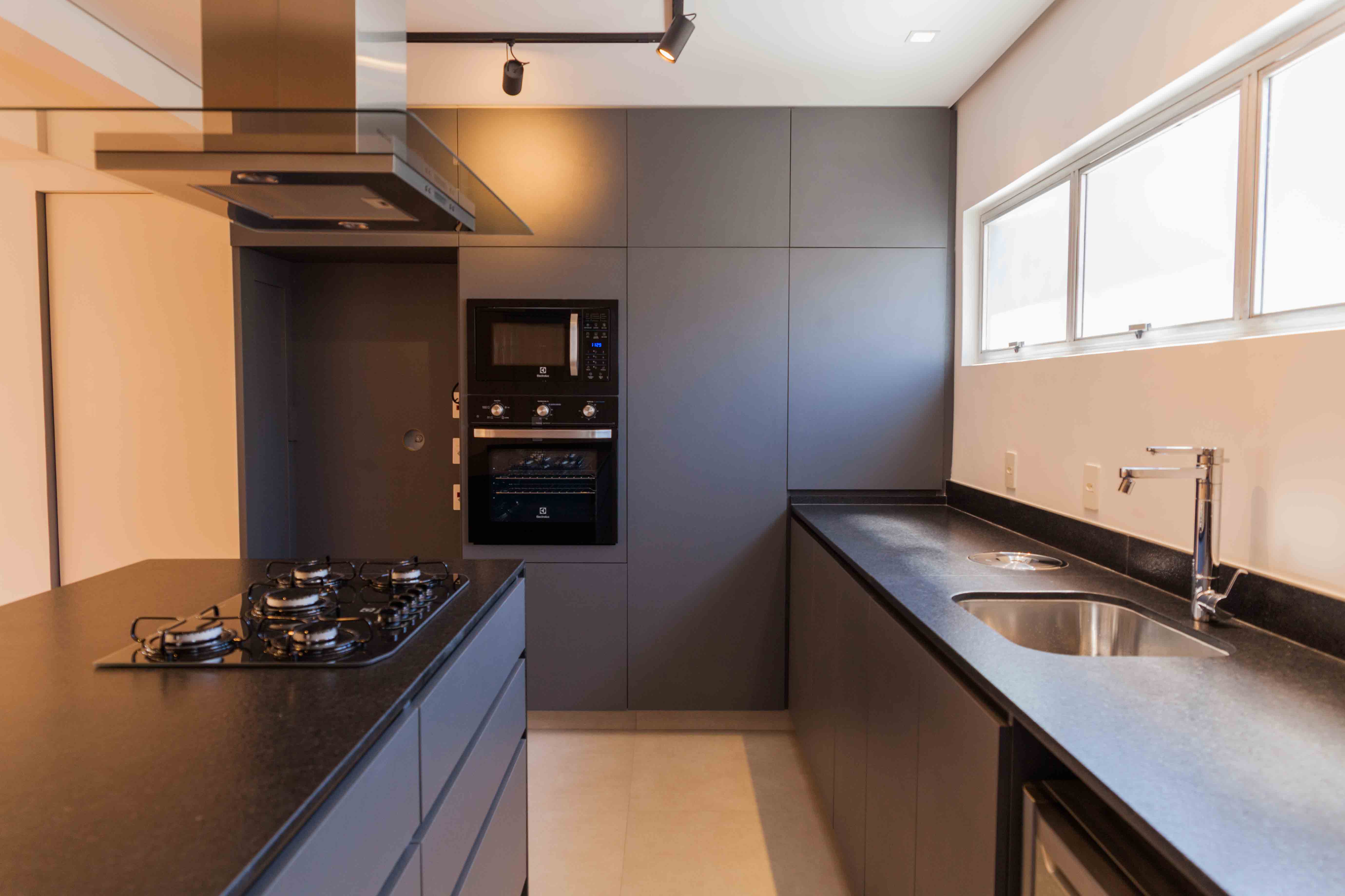 Neste apartamento no Jardins, Fernanda utilizou materiais de alta tecnologia e durabilidade, que facilitam a manutenção e limpeza diária. Locais como a cozinha e área de serviço possuem bancadas em granito preto São Gabriel escovado, por ser bastante resistente e fácil de limpar. Já nos banheiros foi instalado um porcelanato de grande formato, com textura de cimento queimado e chuveiros que possuem tecnologia que economiza água.