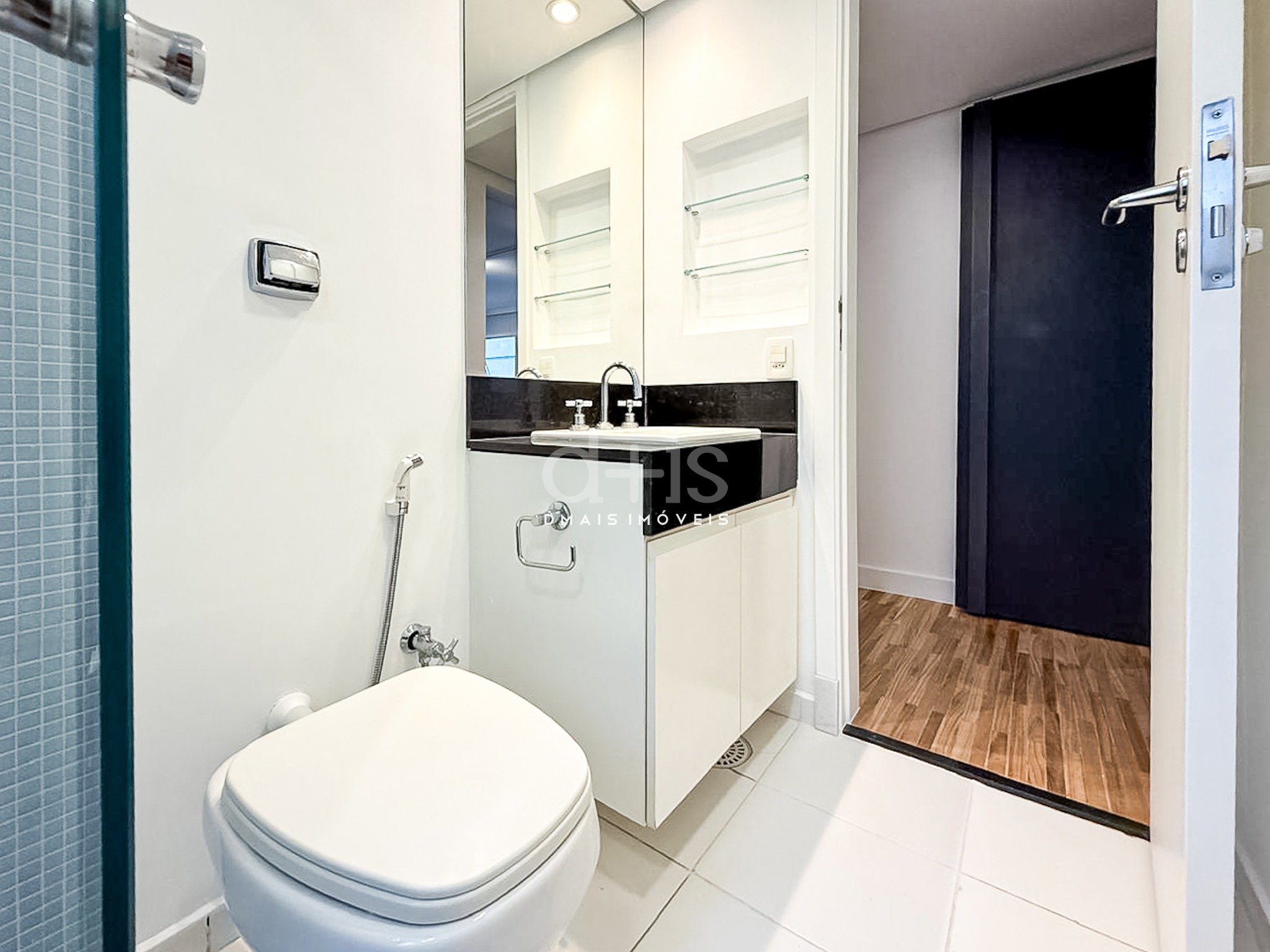 A planta conta com dois dormitórios, incluindo uma suíte espaçosa, além de banheiro social, lavabo e área de serviço. O apartamento possui ainda uma vaga de garagem.