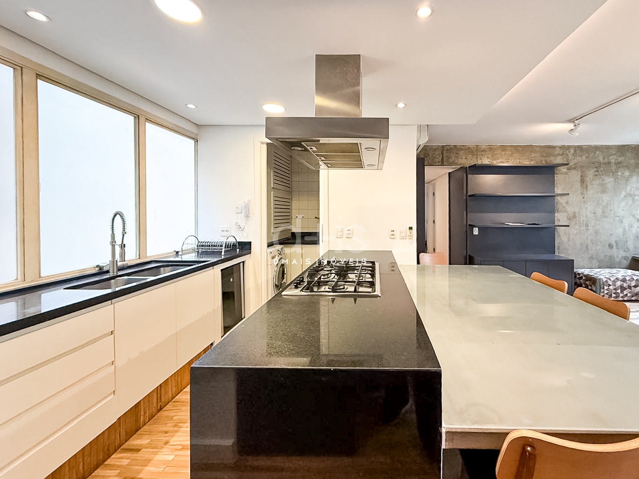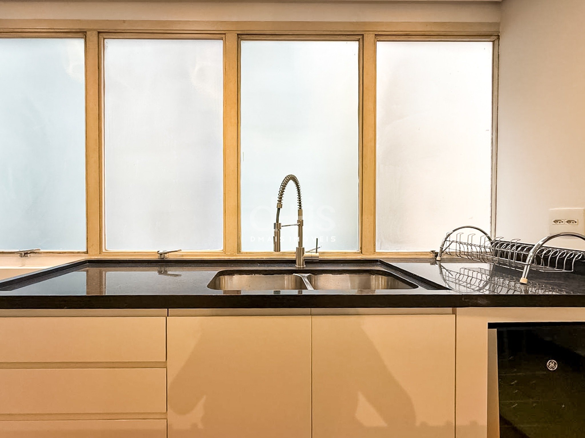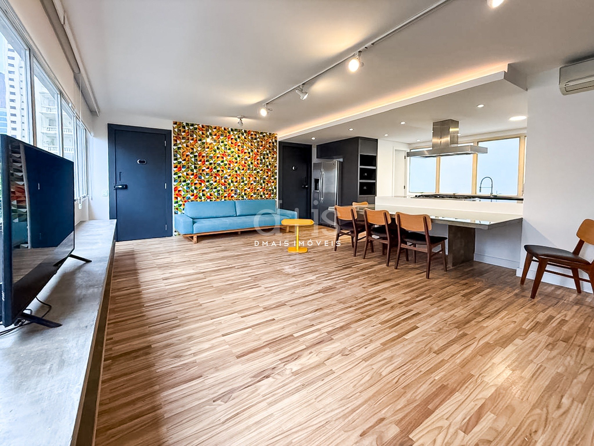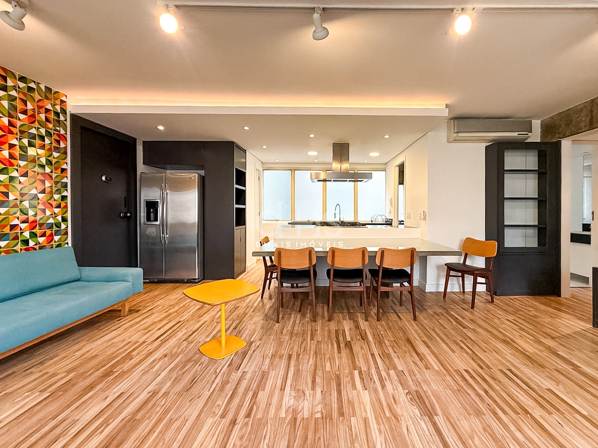 Reformado com estilo industrial, o living recebe luz natural por janelões que percorrem toda a sala e se integra à cozinha americana moderna. O projeto se destaca pelo piso de tacos de madeira, ar-condicionado e marcenaria planejada. Na sala, um painel exclusivo de azulejos assinado por Alexandre Mancini cria um ponto focal único no ambiente.