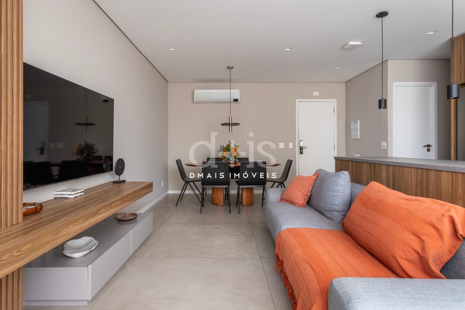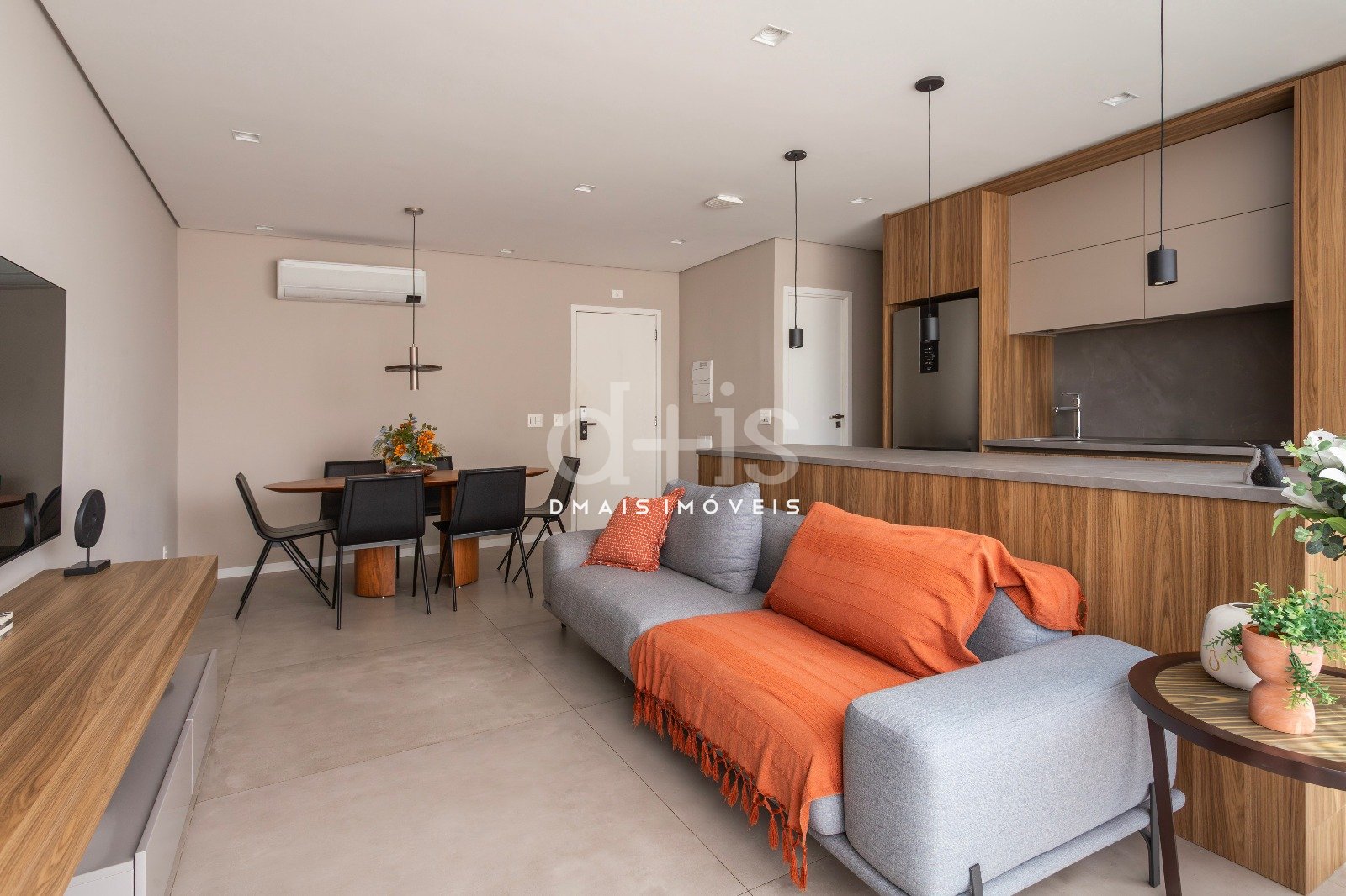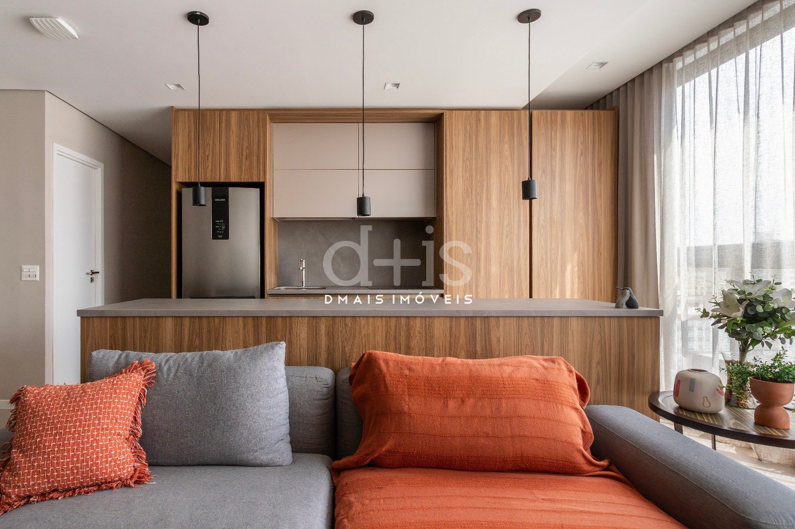 O living com janelões recebe excelente luz natural e se integra à cozinha com armários planejados, criando um ambiente funcional e acolhedor.