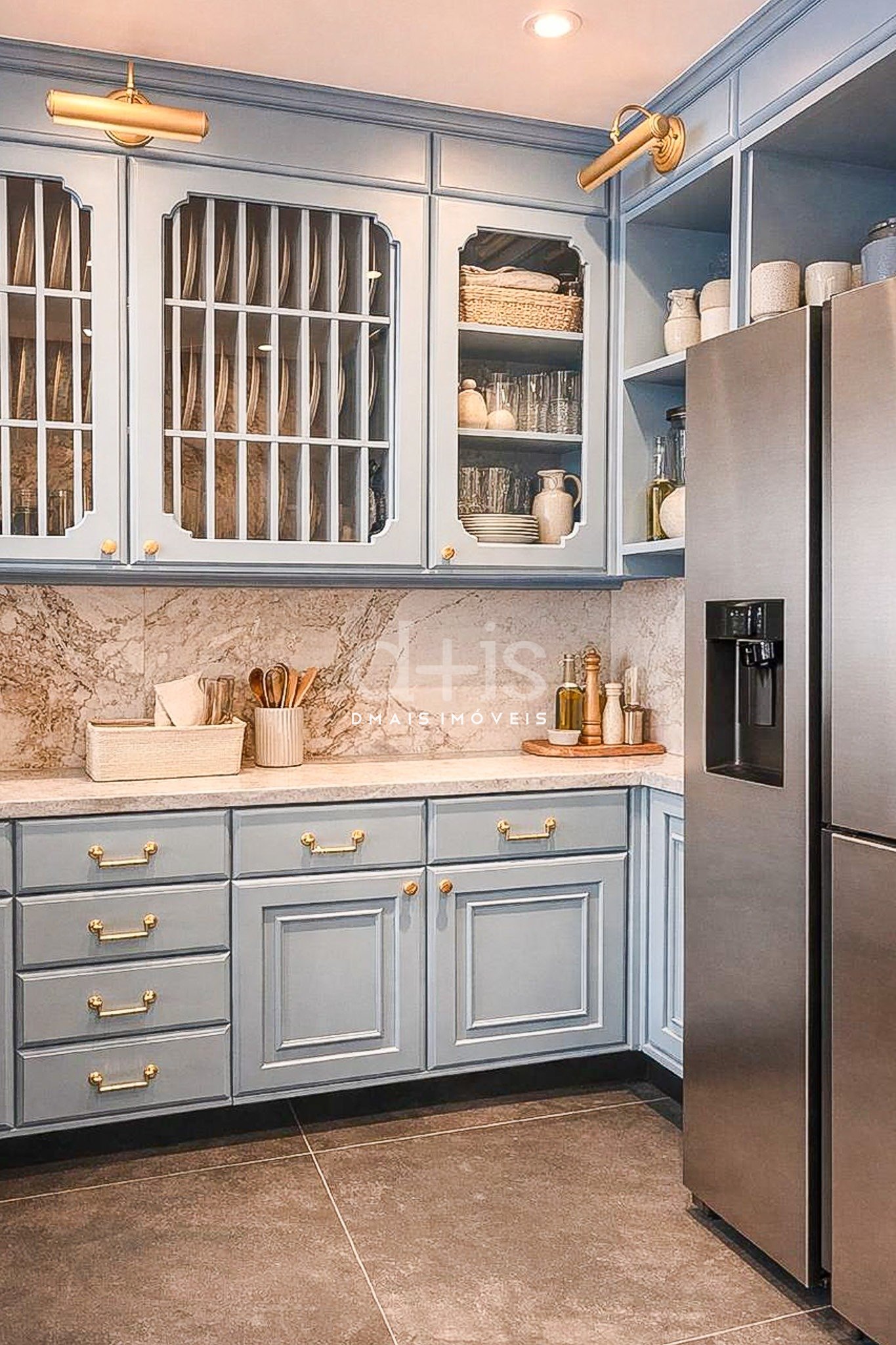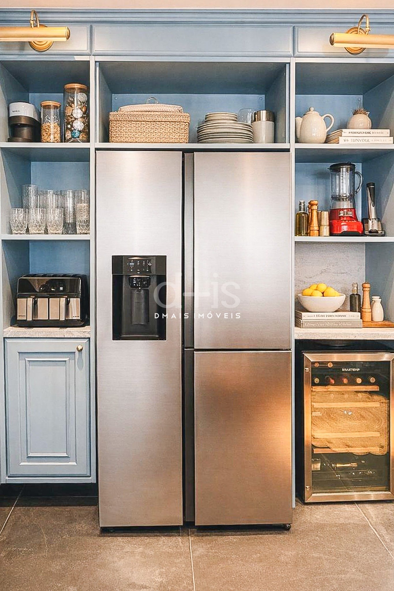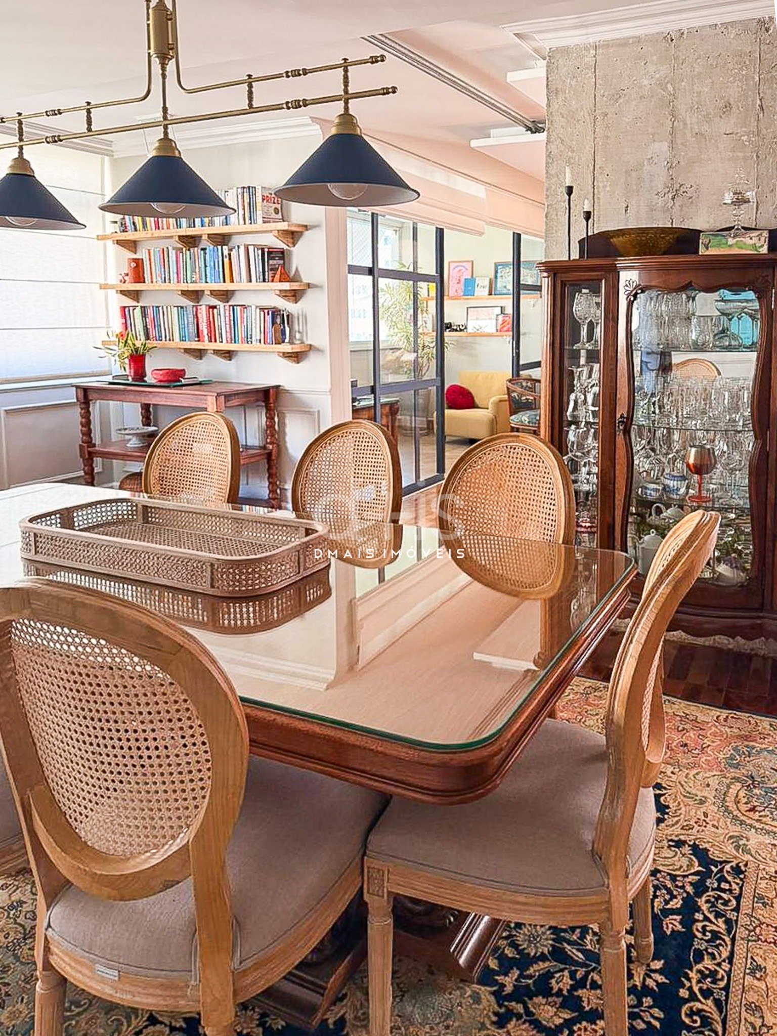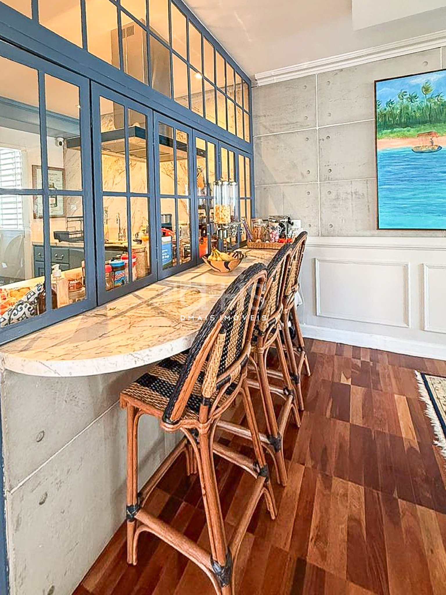O living para dois ambientes é iluminado por janelões e se integra à sala de jantar e ao home office, criando um espaço fluido e acolhedor. A cozinha, ampla e com estilo retrô, é visualmente integrada por elegantes portas de vidro e bancada, unindo funcionalidade e personalidade.