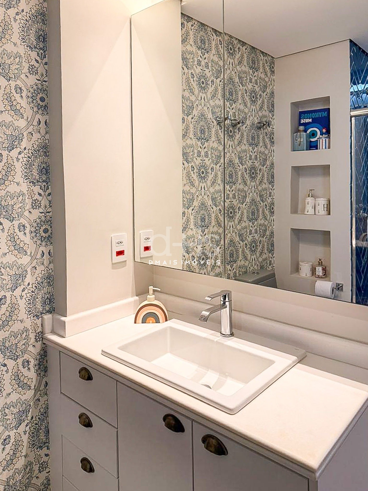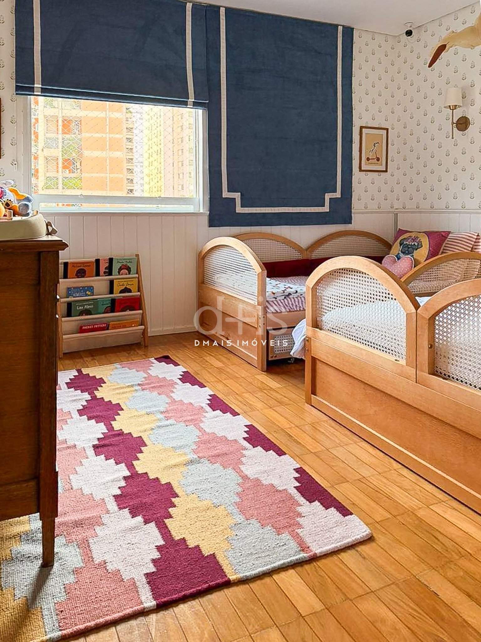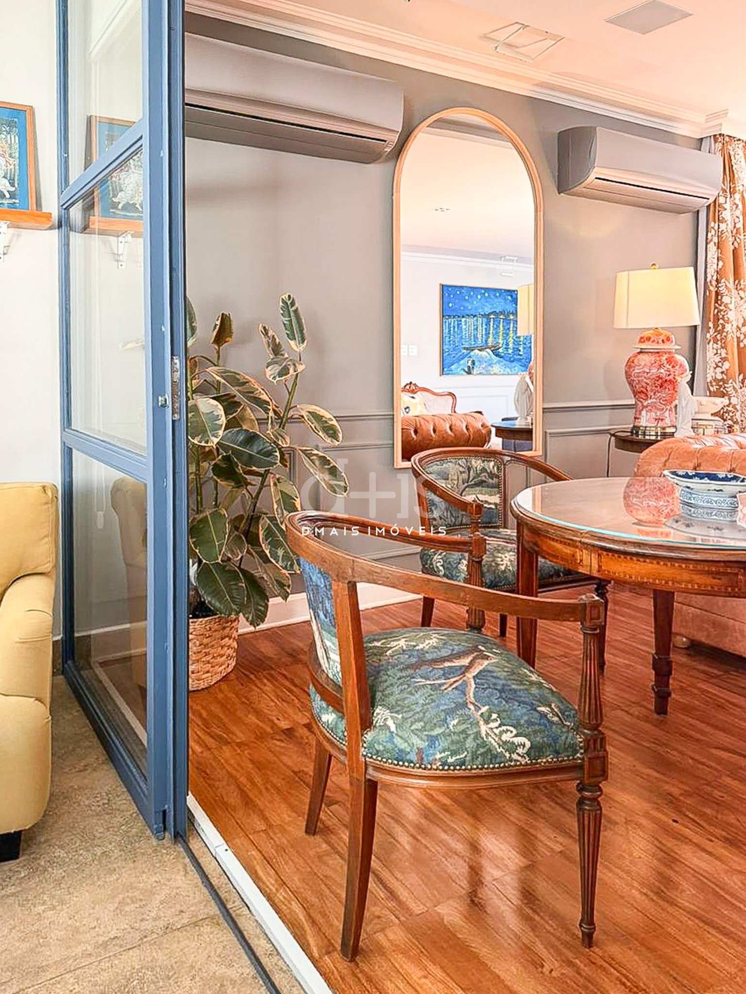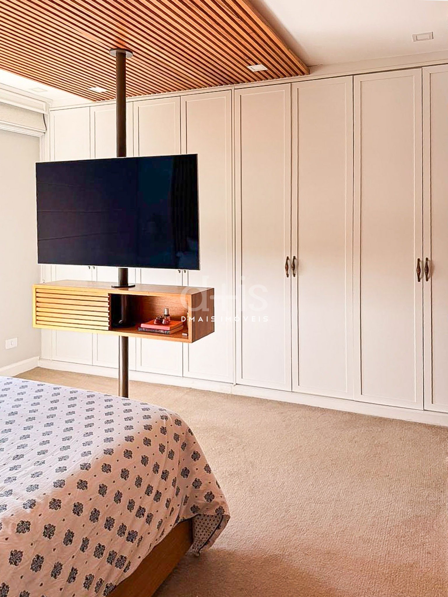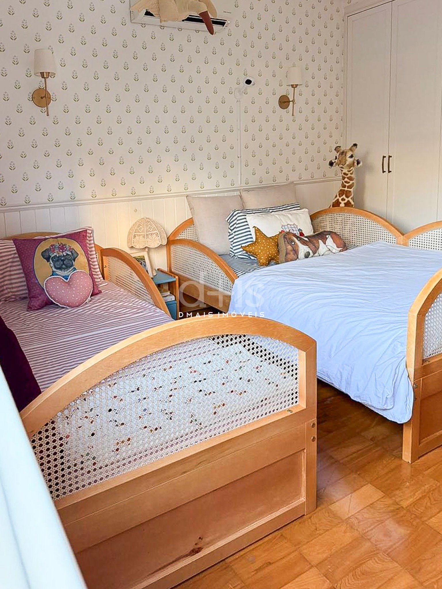 Na área íntima, três dormitórios com ótima iluminação, incluindo uma suíte generosa com closet e banheira. O apartamento conta ainda com ar-condicionado e piso de madeira, reforçando o clima acolhedor.