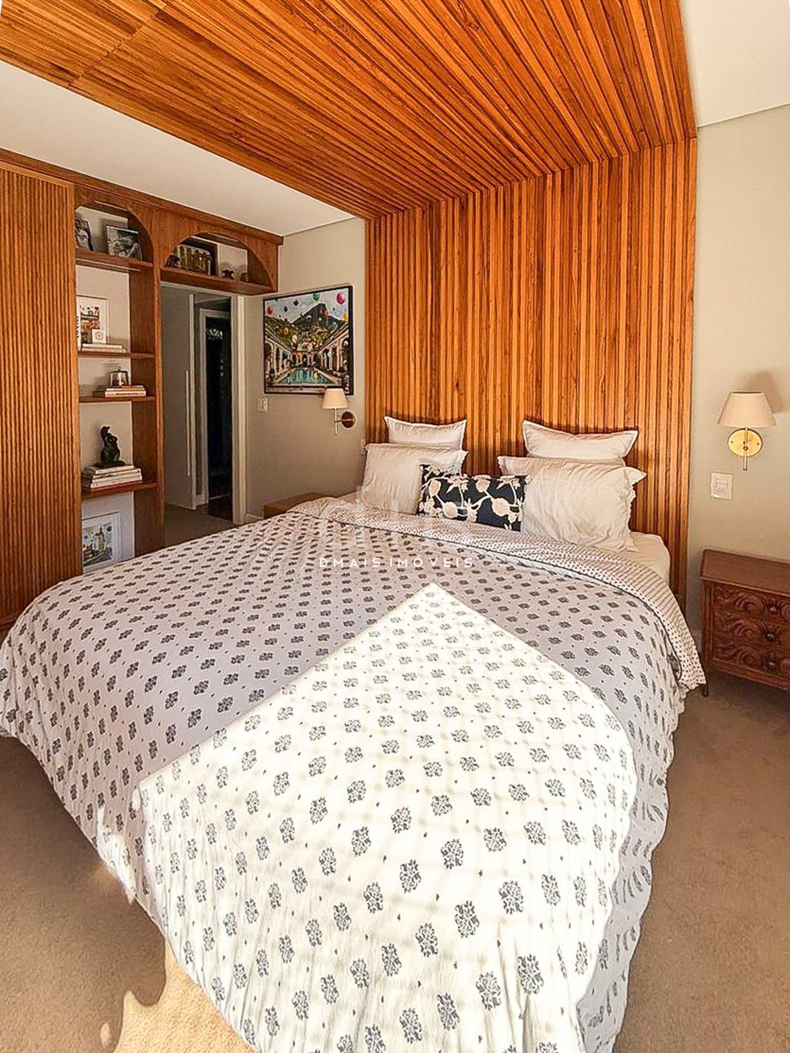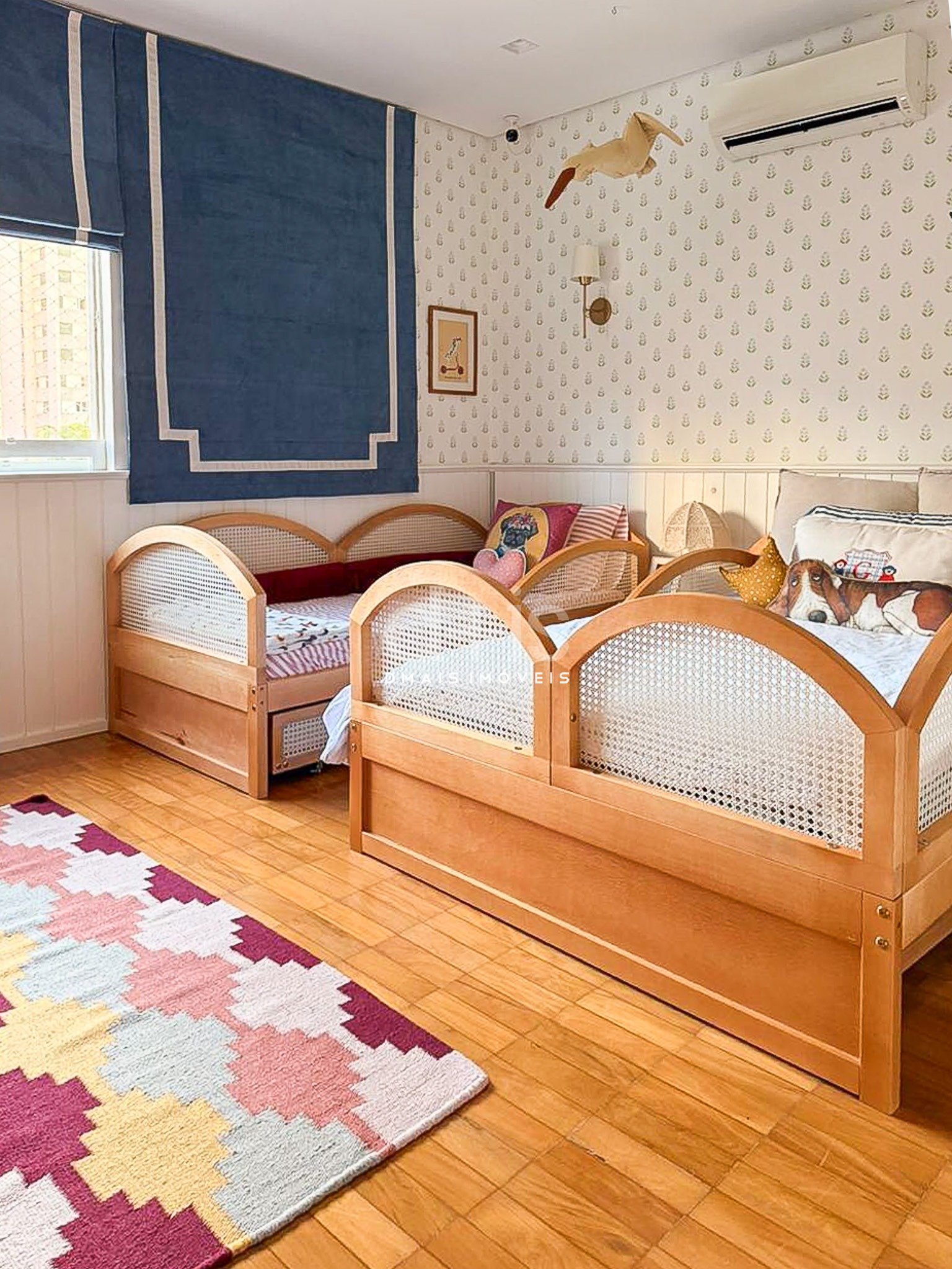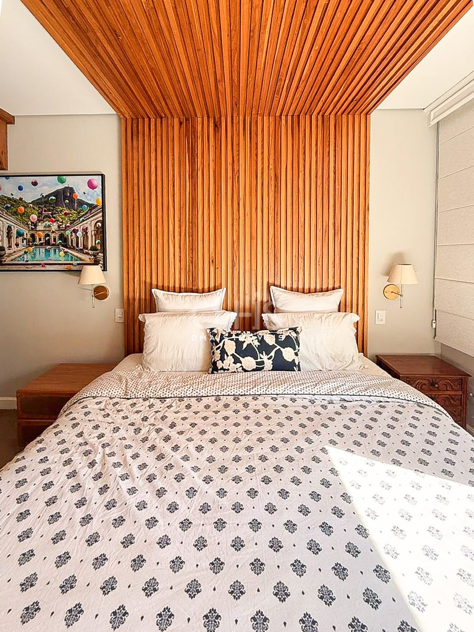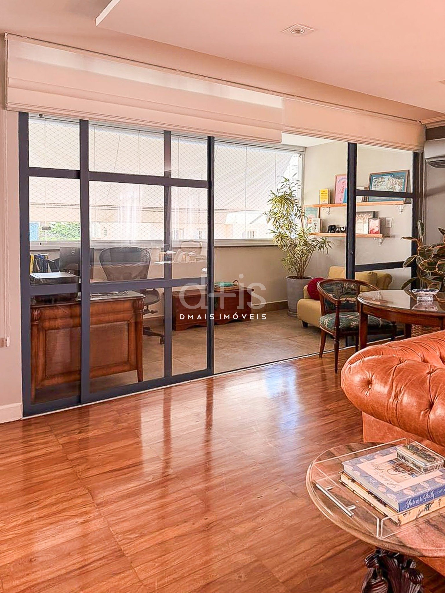 Na área íntima, três dormitórios com ótima iluminação, incluindo uma suíte generosa com closet e banheira. O apartamento conta ainda com ar-condicionado e piso de madeira, reforçando o clima acolhedor.