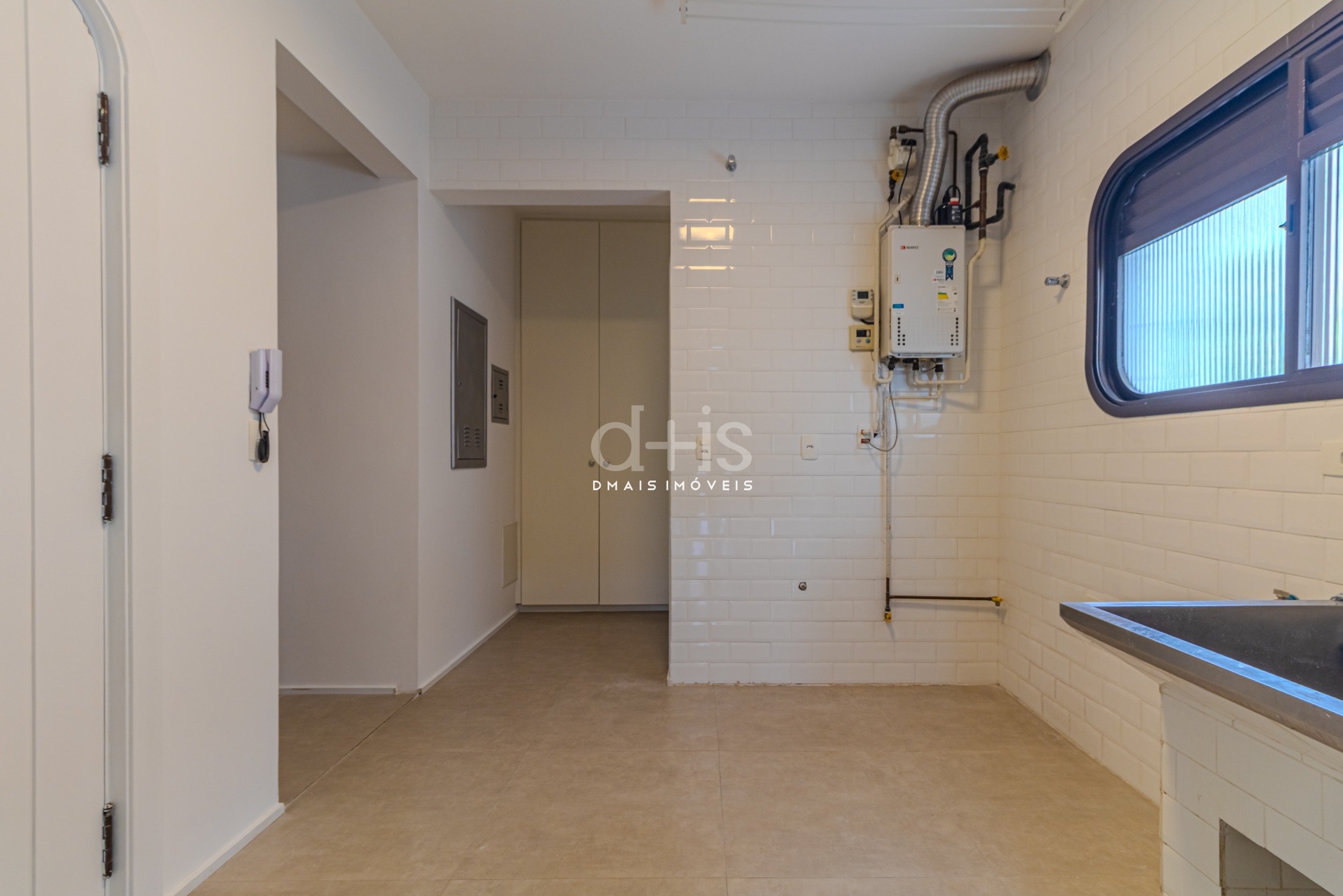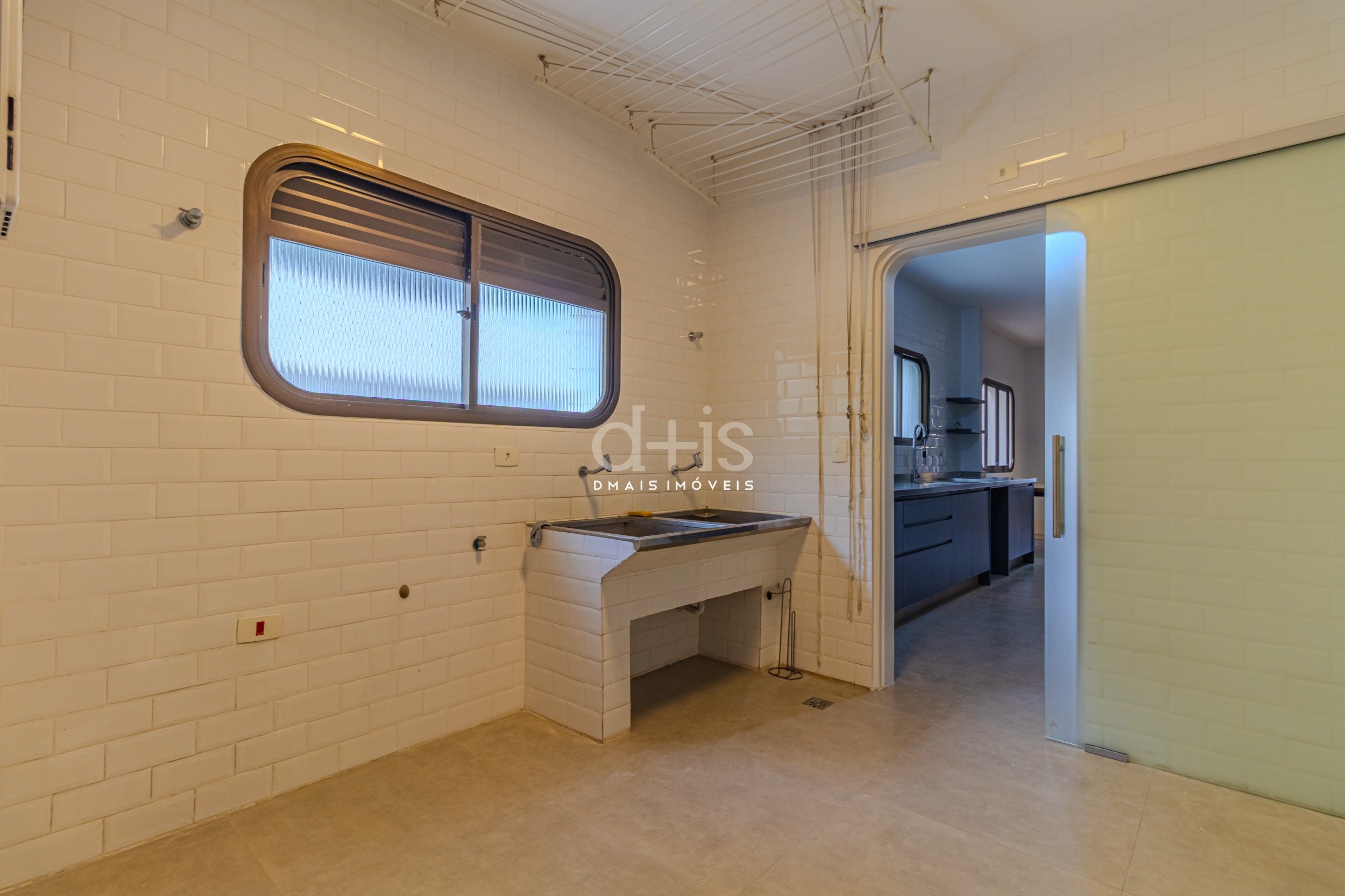 A cozinha é ampla, com copa e móveis sob medida, além de área de serviço completa e dependência de empregada.