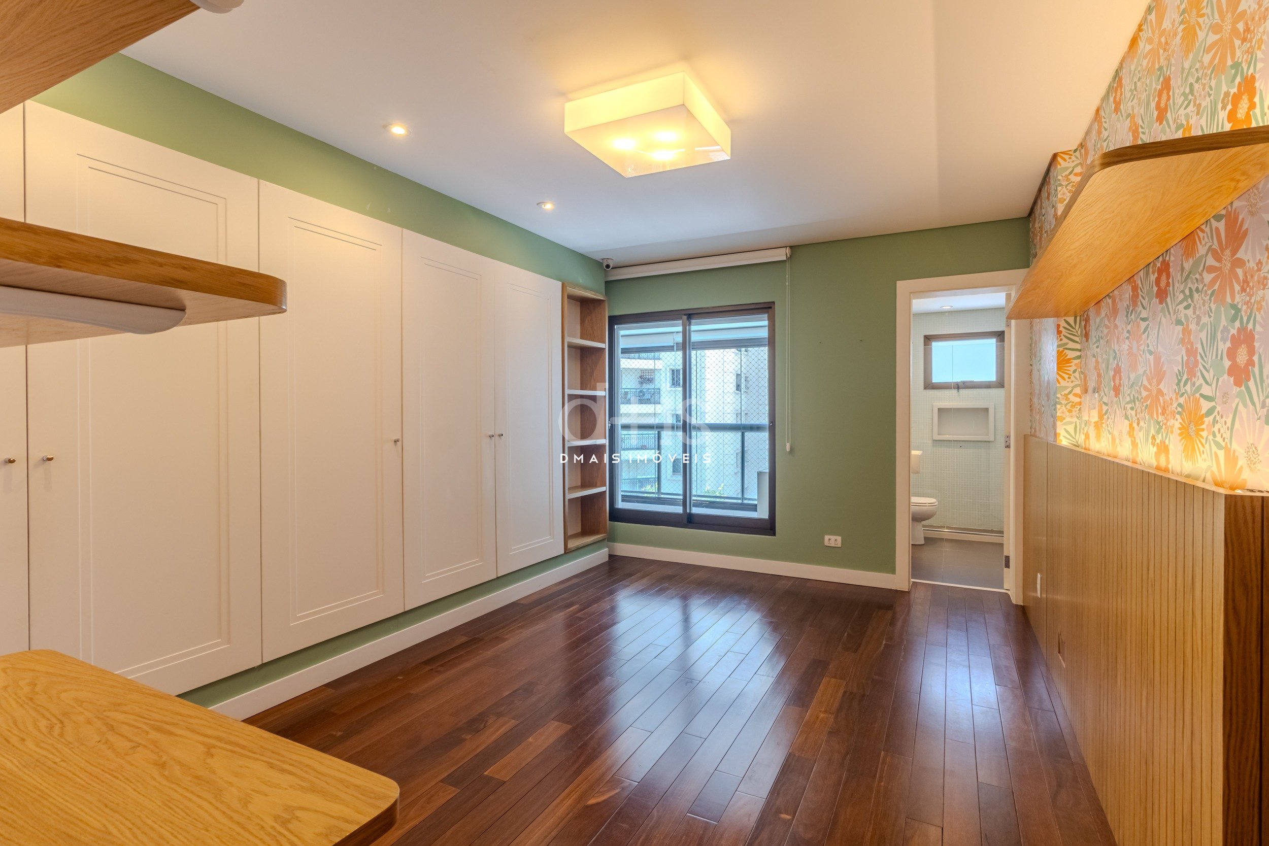O hall privativo conduz a um living generoso para dois ambientes, integrado à varanda ensolarada e à sala de jantar. A cozinha moderna com copa dialoga com a área de serviço e dependência completa. São três suítes confortáveis, piso de madeira no living e dormitórios, armários embutidos e ar-condicionado em todos os ambientes.